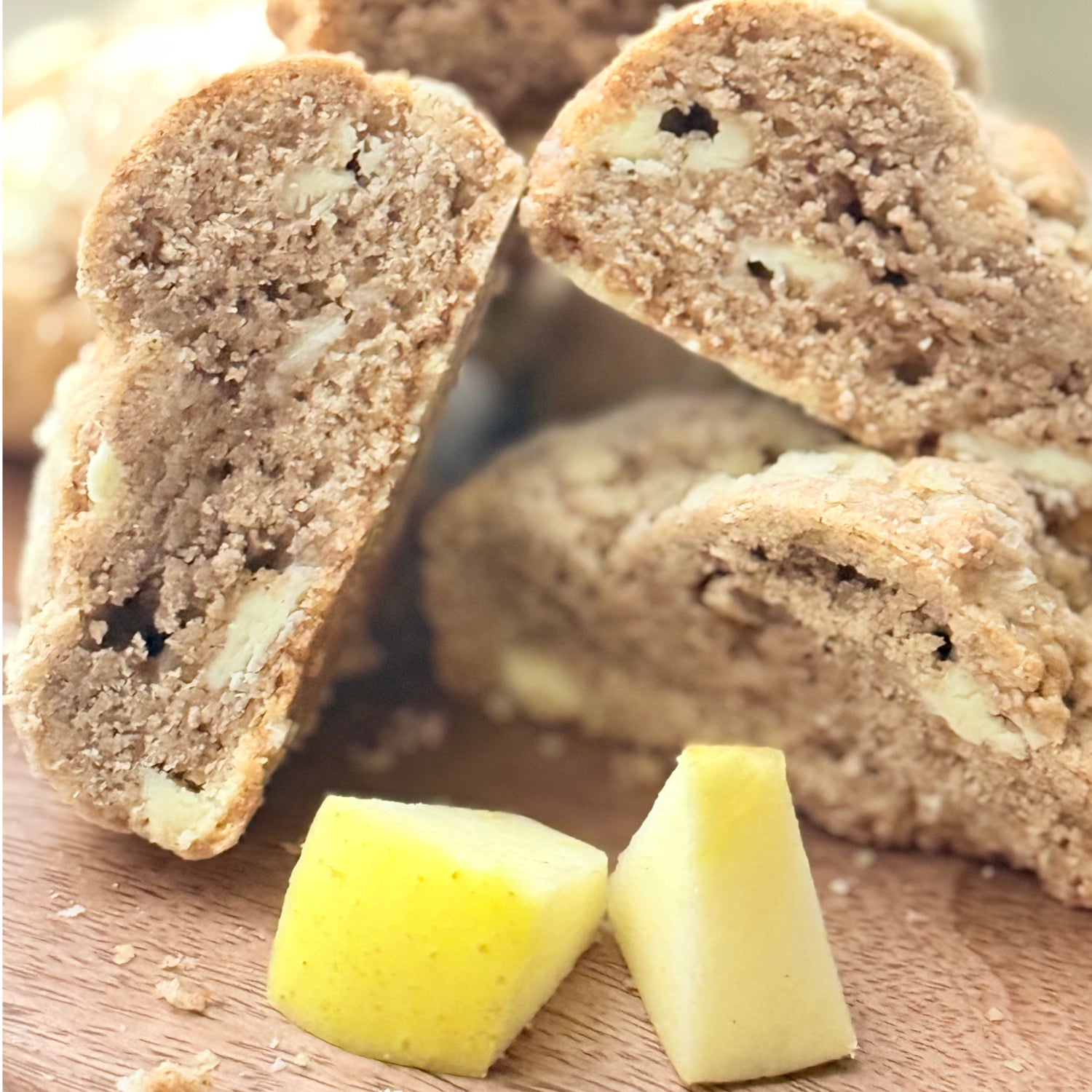 Kann Spuren von Nüssen enthalten. - Apfel-Zimt: Apfel im Cookie & Apfelkuchen-Streusel am Cookie machen diesen Cookie zusammen mit weißen Schokochips & Zimt zum Wintergenuss.