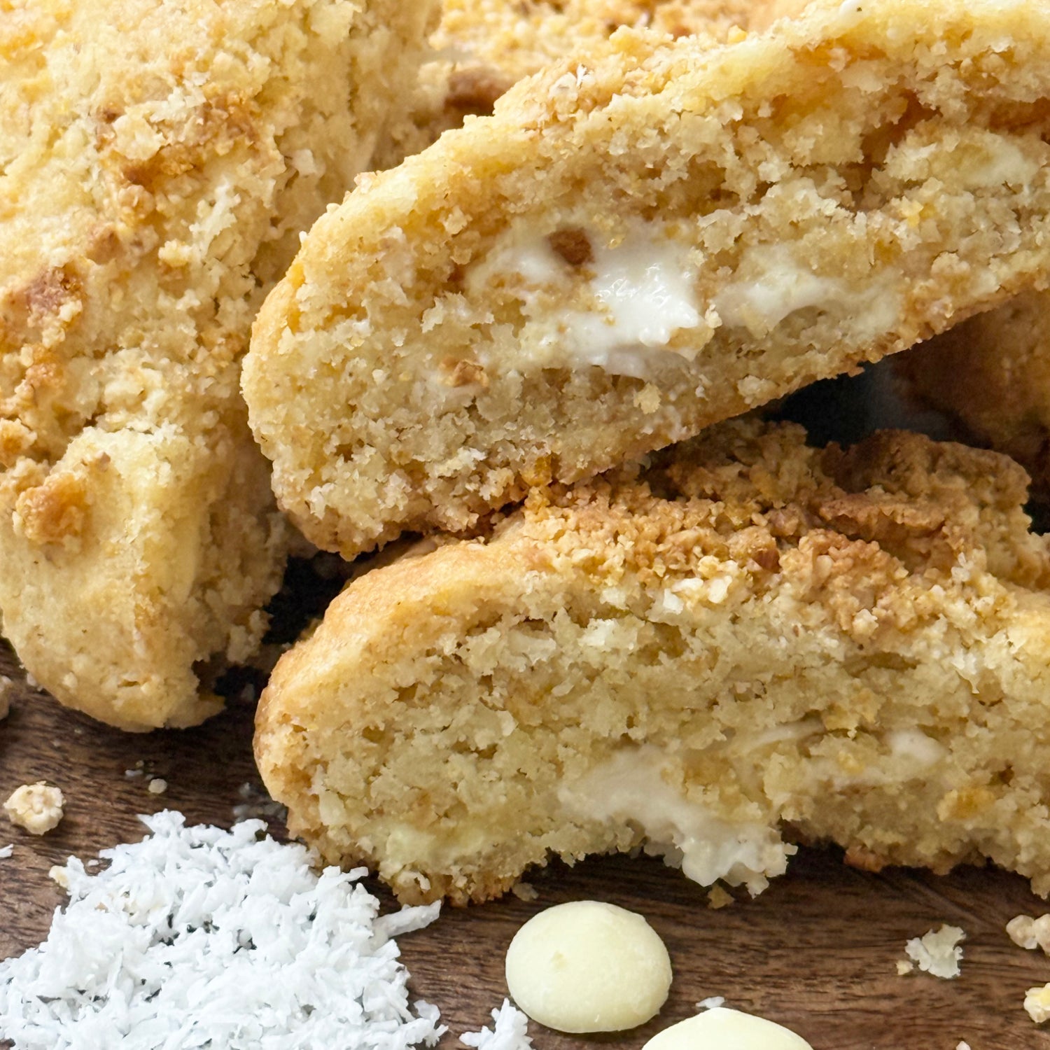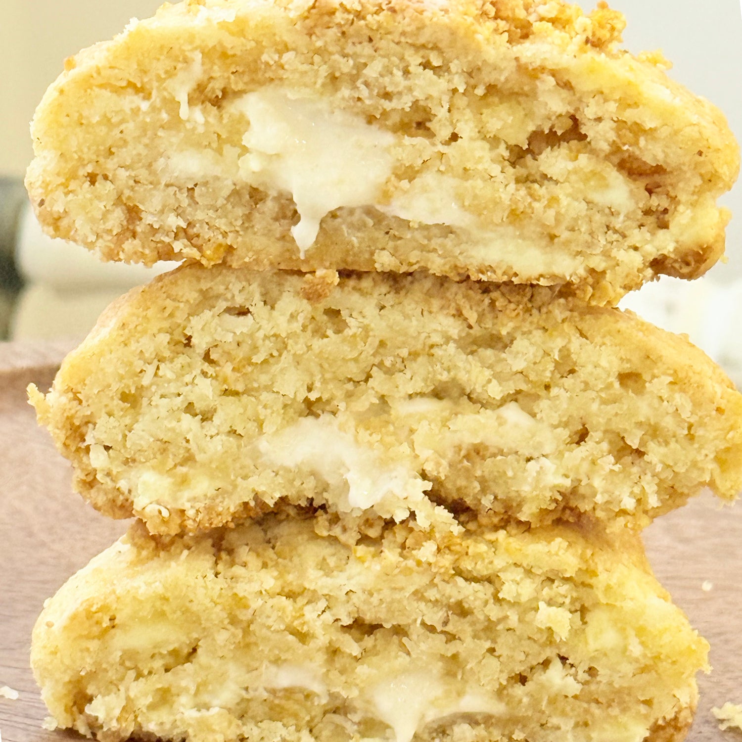 Nach Cakesie Rezept ist dieser Kokos-Cookie auch mit einem speziellen Crunch versehen aus Cornflakes, Kokos, Mandel & weißer Schokolade. Obendrein findet sich eine Kokos-Mandel-Füllung im Inneren.