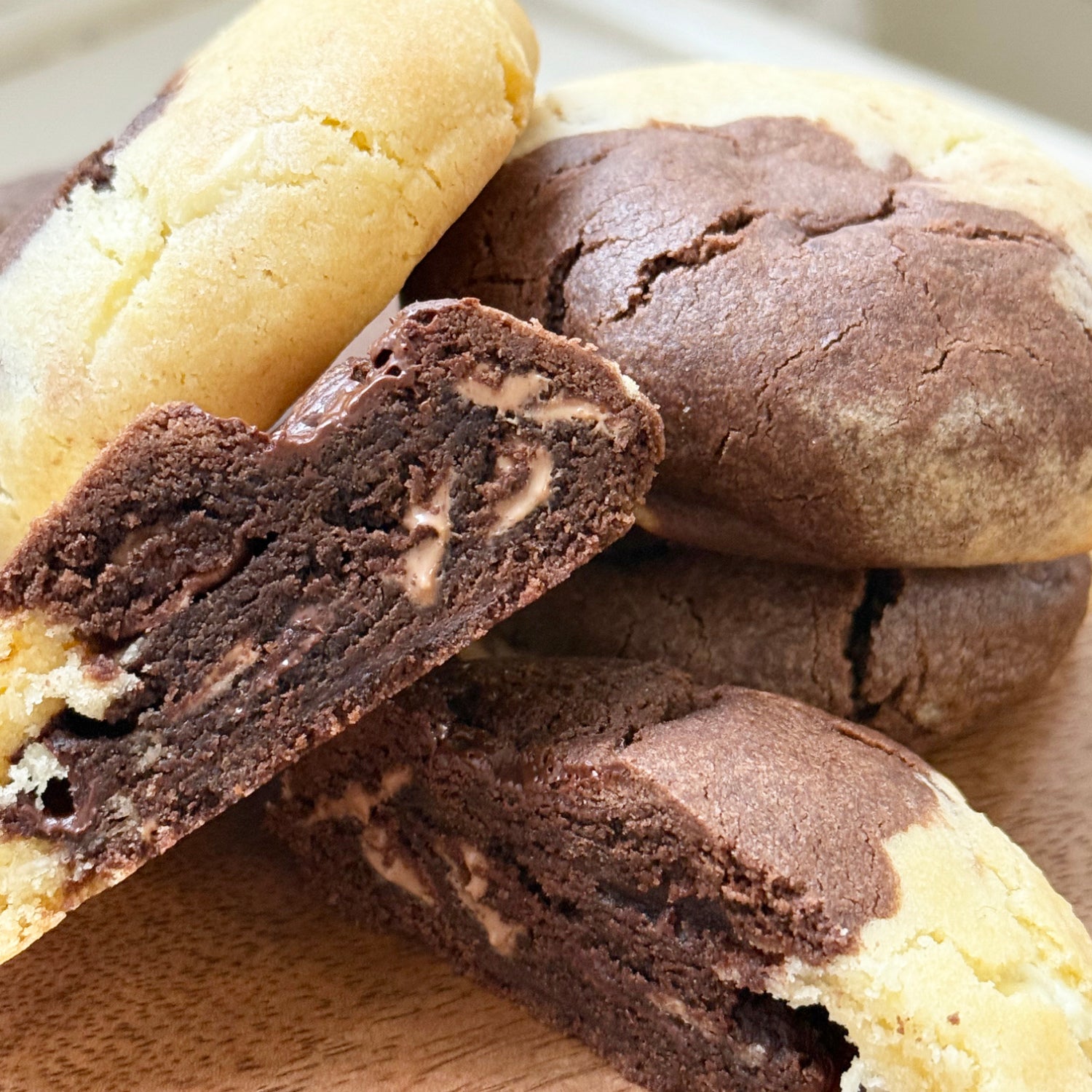 Wie ein Marmorkuchen halb hell und halb dunkel ist dieser Cookie (ebenfalls eine Cakesie-Erfindung :)!) Außen knusprig, innen fein mit Chocolate Chips in weiß, Milchschoko & zartbitter.