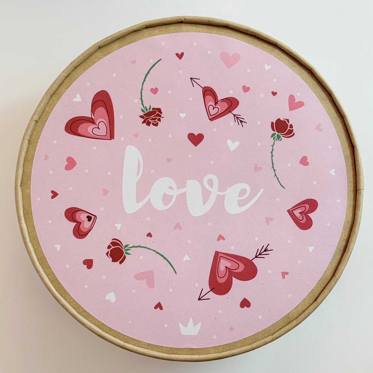 10 Stück feine Macarons befinden sich in dieser hübschen runden Schachtel, die mit LOVE Schriftzug & Herzen verziert ist.